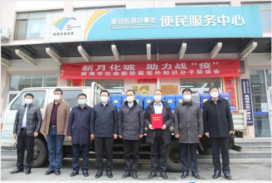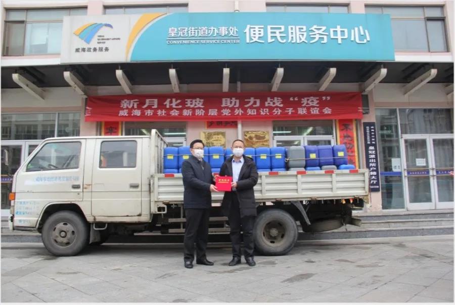2月28日,威海新月化玻儀器有限公司總經理李進華為皇冠街道辦事處捐贈了5噸消毒液,支援街道的疫情防控工作。區工委委員、管委會副主任、組織部部長梁明同志為李總頒發了榮譽證書,市委統戰部班子成員、市工商聯副主席苗建臣同志,皇冠街道黨工委書記劉健同志,皇冠街道黨工委副書記、辦事處主任徐翔同志,皇冠街道辦事處人大聯絡辦公室主任初玉良同志,皇冠街道黨工委副書記劉玉凱同志參加了捐贈儀式,對威海新月化玻儀器有限公司的捐贈表示真誠感謝!